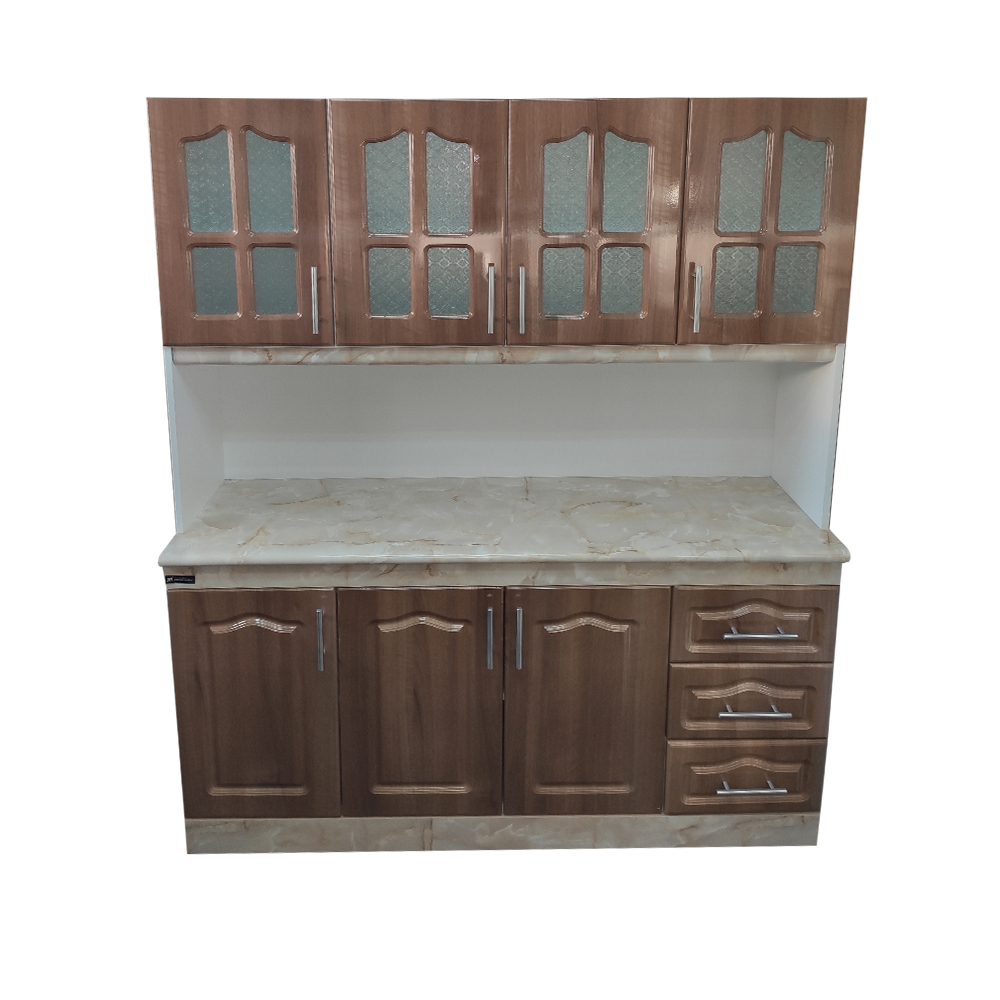 Hermoso mueble de cocina compacto de 4 puertas superiores y 3 puertas inferiores con repisas al interior. Además dispone de 3 cajones amplios con corredores telescópicos y manillas metálicas . Las puertas de este mueble son confeccionadas en material termolaminado de alta resistencia. Color Madera Brillante.